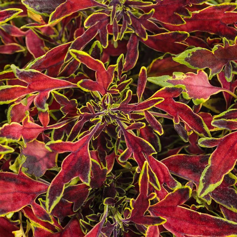A sun and shade tolerant variety with large leaves and a compact habit, the vivid red foliage is accented by burgundy-brown markings, offers garden texture galore! Removing flowers as they appear will help keep the foliage looking its best.