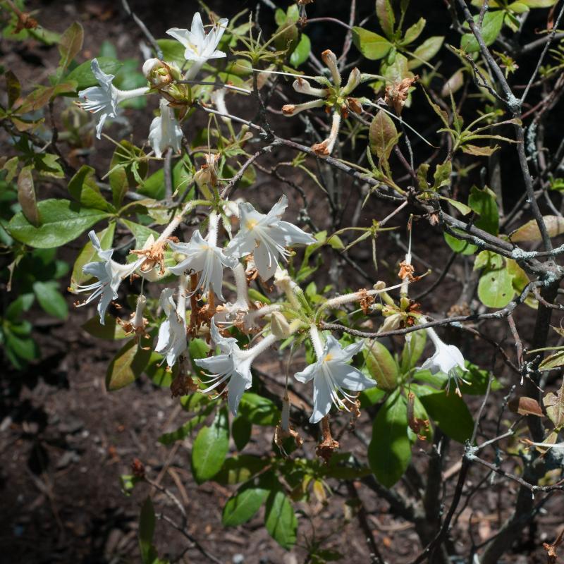 A rare deciduous azalea native to the southeastern U.S., Rhododendron viscosepalum features elegant, fragrant white flowers with long stamens and a subtle blush of pink. Blooms appear in spring before foliage fully emerges.