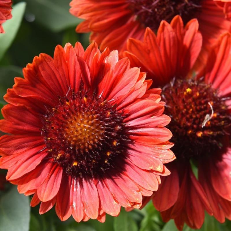 'Spintop Red' offers large deep orange-red flowers with prominent yellow centers that will bloom from early summer to fall amid compact mounds of fuzzy gray-green foliage.