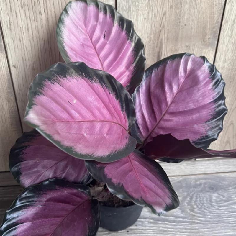 Oblong dark green leaves with pink stripes going from the mid rib to the margin, and deep magenta undersides makes this one of the most popular Calatheas.