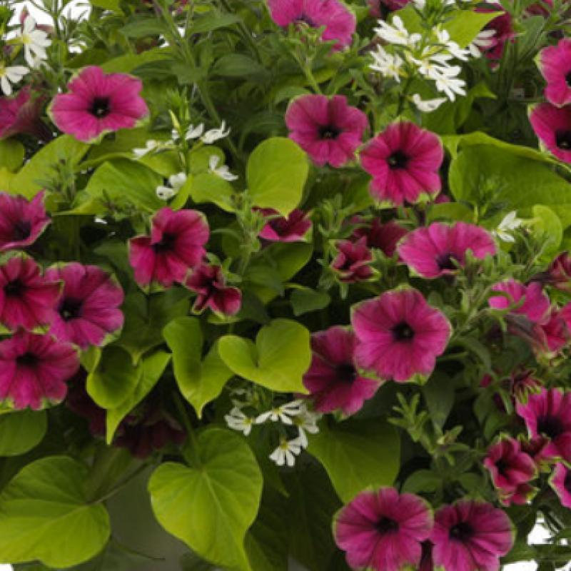 Add instant color to a deck, porch or patio with our combination hanging baskets and patio pots. Each combination brings together several popular varieties of annuals into a group that packs a punch of intense color.