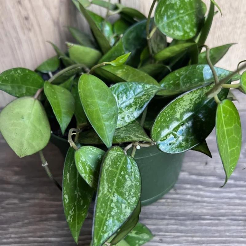 This vining hoya features thick, glossy green leaves with subtle silvery speckling and a distinctive dark edge. Slow-growing but rewarding, it's ideal for hanging baskets or training on a trellis indoors.