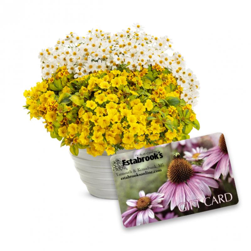 Add instant charm with this lush patio planter bursting with yellow blooms - perfect for decks, patios, or entryways. Includes a $100 Estabrook's Gift Card to keep the garden growing. A beautiful gift with lasting appeal! Pottery not included.