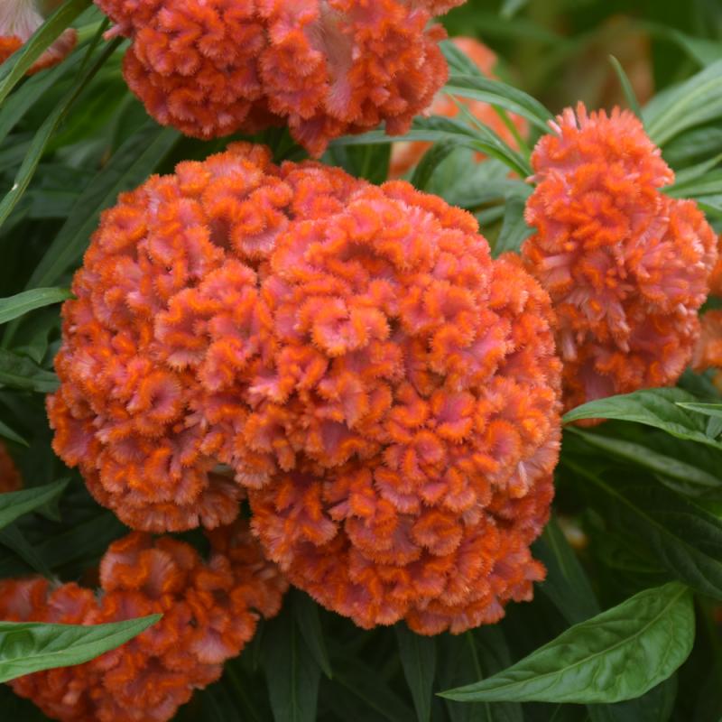 A bold, textural annual with dense, wavy blooms in fiery orange shades. These unique flower heads resemble coral or velvet brains, making a dramatic statement in sunny beds and containers. Heat-tolerant and long-lasting.