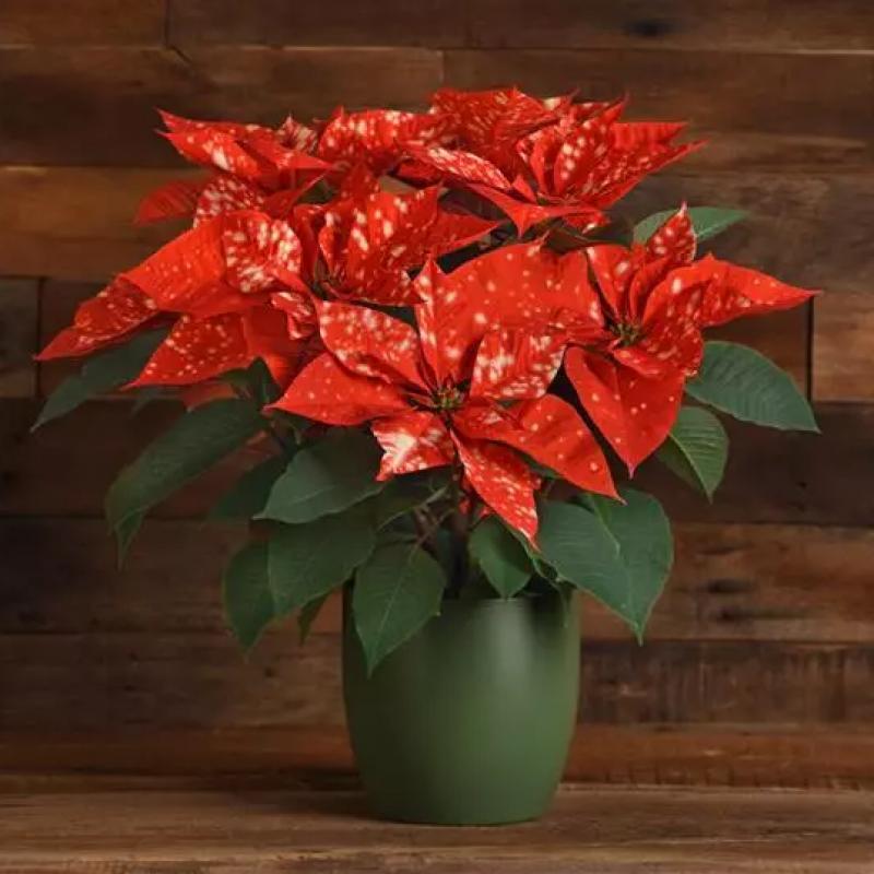 Eye-catching poinsettia with bold orange-red bracts patterned with creamy white speckles, creating a striking “sky-splatter” effect. Rich green foliage makes it a vibrant accent for festive décor.