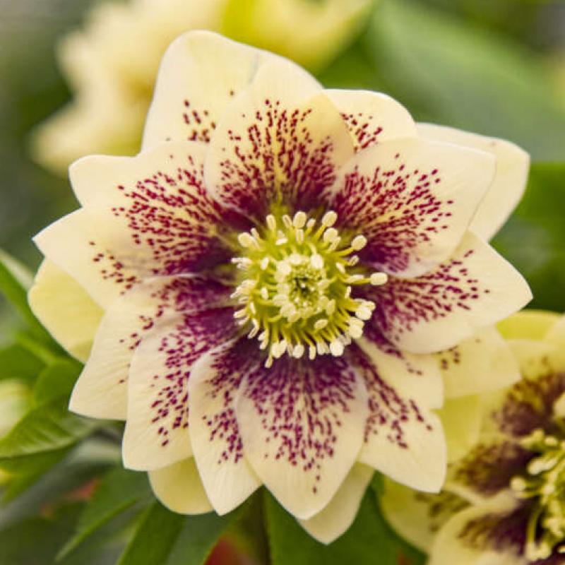 A refined and eye-catching hellebore, 'Father of the Bride' features creamy white flowers dramatically speckled and flushed with deep burgundy near the center. Blooming in late winter to early spring, the long-lasting, outward-facing flowers rise above glossy, evergreen foliage, bringing welcome color and elegance to shaded gardens when little else is in bloom.