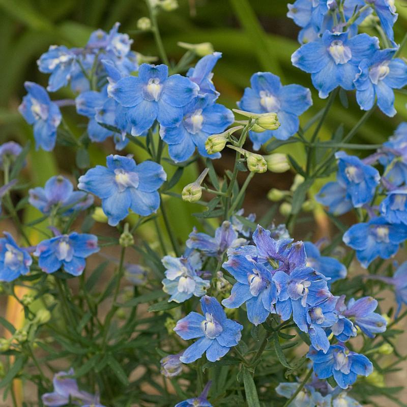 Unlike other tall spiky cultivars, this little beauty forms compact mounds of well-branched foliage covered by sky blue, 1 1/2" flowers all summer. 'Summer Blues' is more heat tolerant and earlier blooming than other delphiniums.