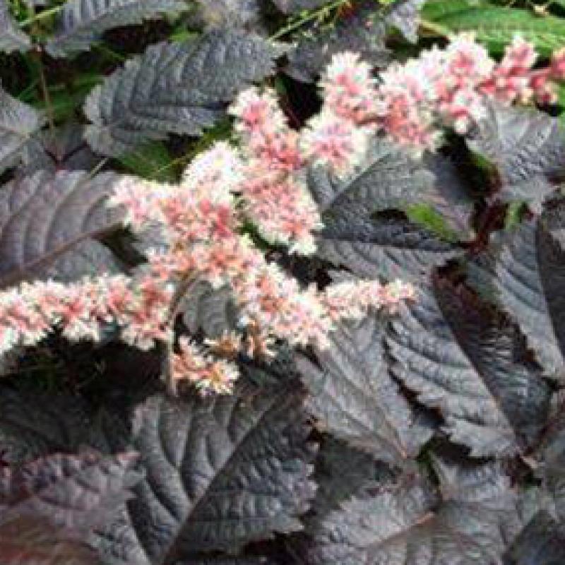 The darkest leaved Astilbe variety, 'Chocolate Shogun' offers deep chocolate brown leaves, red stems and pink flowers that appear in July.