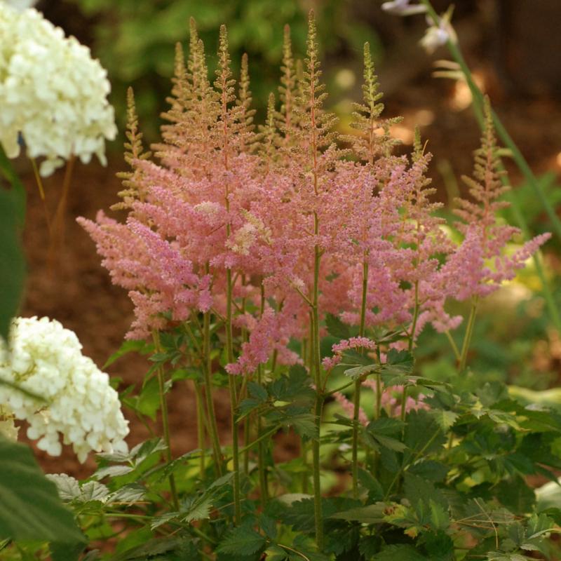 Full upright plumes of pale lavender-pink with dark blue-green foliage appear in late July to early August on this stunning plant.