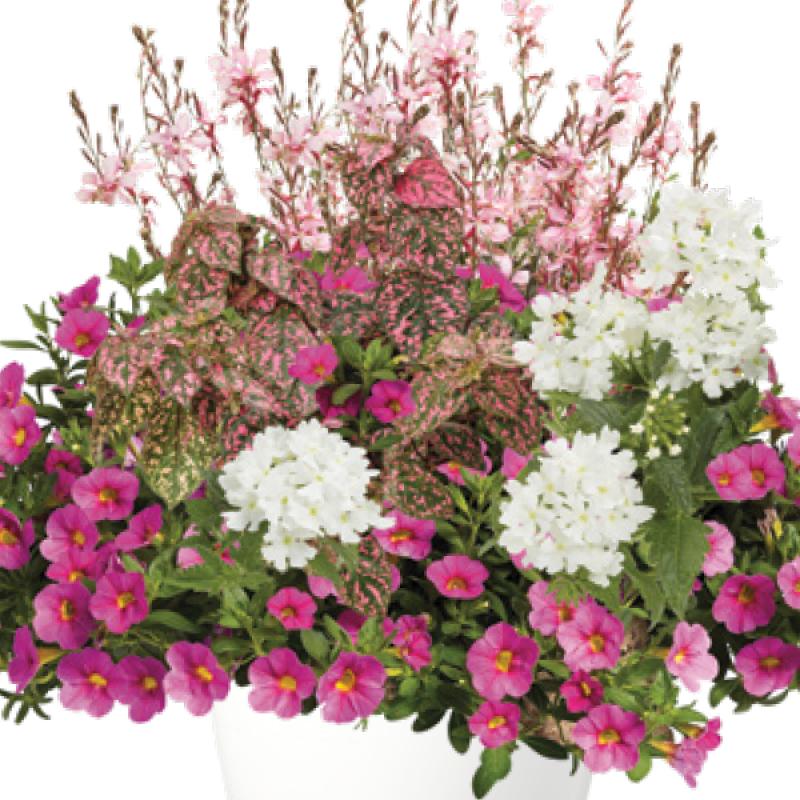 Add instant color to a deck, porch or patio with our combination hanging baskets and patio pots. Each combination brings together several colorful varieties of annuals into a group that packs a punch of intense color.