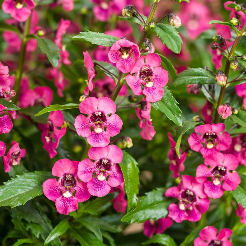 Angelonia produces upright spikes of vibrant pink, snapdragon-like flowers that bloom continuously from late spring through frost. Heat tolerant and low maintenance, it adds vertical color to containers, borders, and summer landscapes.