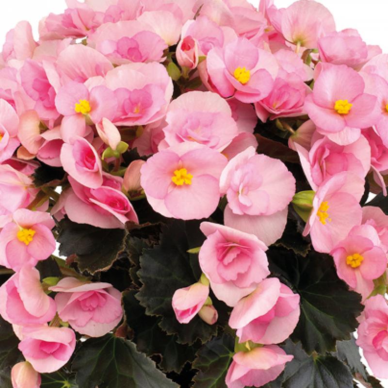 Begonia 'Adonia Light Pink' produces abundant soft pink blooms with bright yellow centers above dark green foliage. Its compact, mounded habit makes it an excellent choice for containers, hanging baskets, and shaded garden beds, providing continuous color from spring through frost.