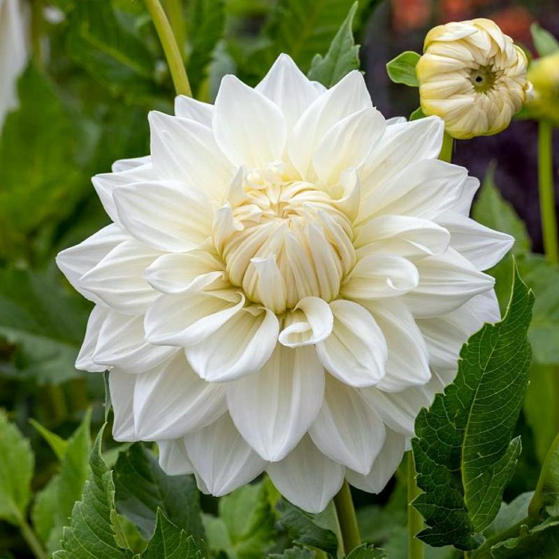 Dahlia 'Bull's Pride' produces large, fully double blooms in creamy white with layers of elegantly arranged petals. These dramatic flowers appear from midsummer until frost and make an outstanding focal point in garden beds, borders, and cutting gardens.