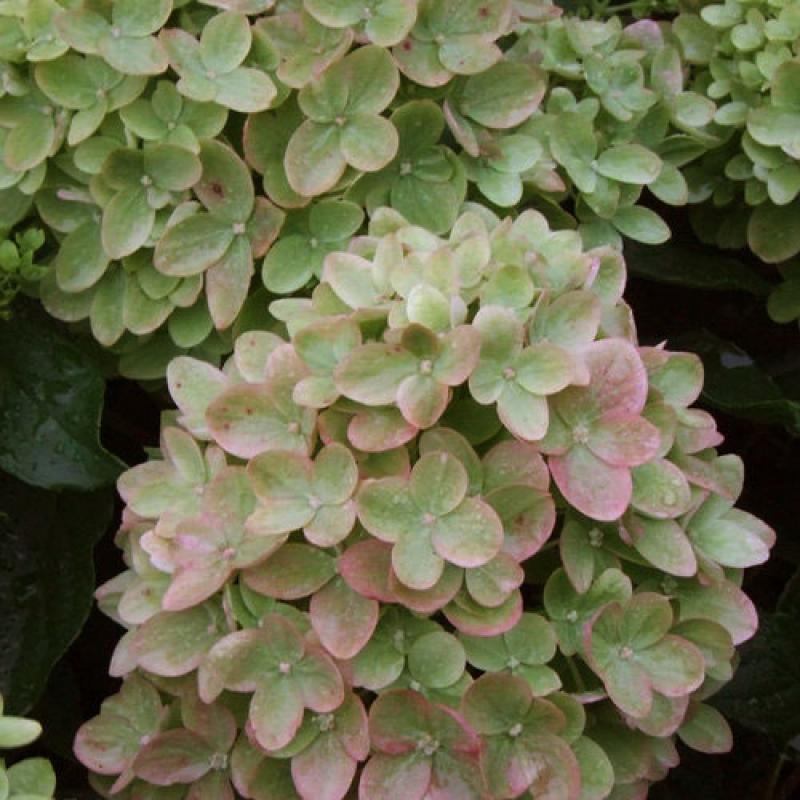 A dwarf form of the extremely popular 'Limelight' hydrangea, this gem has the same great flowers but is about a third the size. Soft lime-green flowers emerge in July and mature to pink in fall.