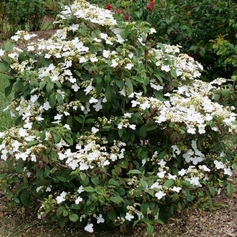 A compact and refined form of doublefile viburnum with horizontal branching, white lacecap flowers in spring, and red berries maturing to black. 'Steady Eddy' offers reliable performance, fall color, and multi-season appeal in a tidy shape.