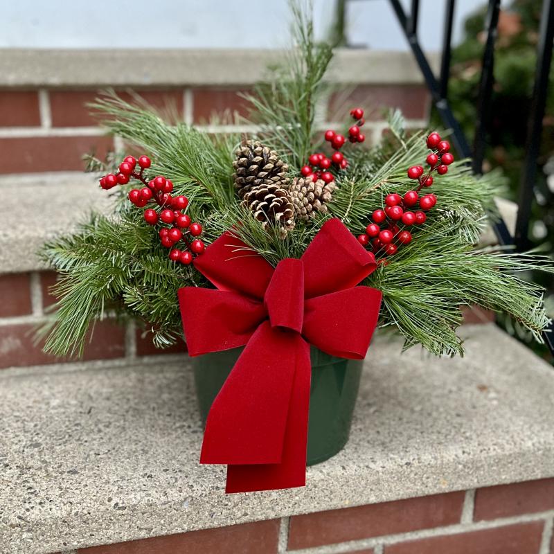 Decorate your doorsteps with fragrant greens, winterberry stems, cones and a beautiful bow in a traditional green pot.
