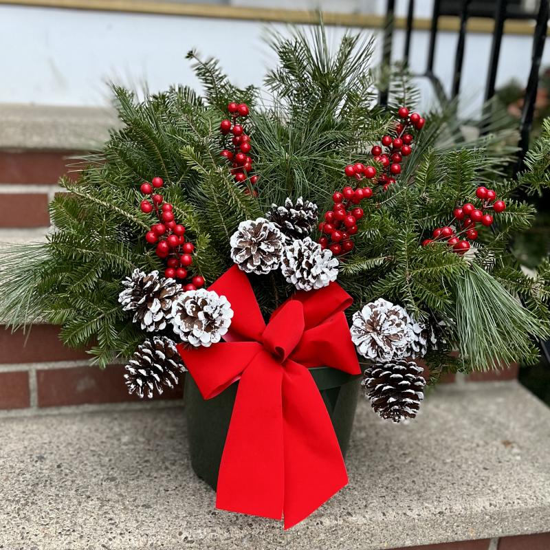 Decorate your doorsteps with fragrant greens, winterberry stems, cones and a beautiful bow in a traditional green pot.