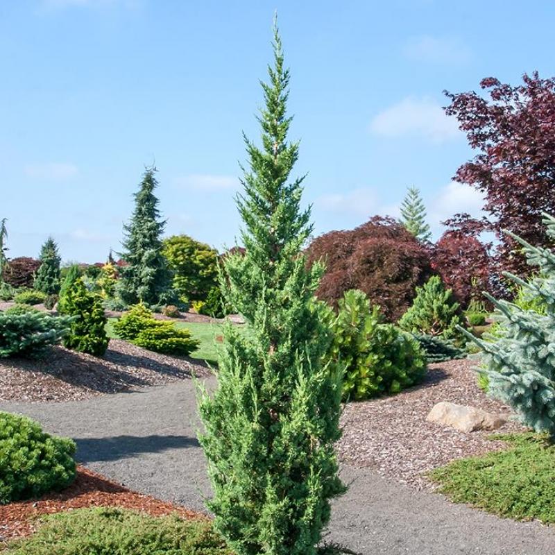 A narrow, upright evergreen with silvery-blue foliage that maintains its color beautifully through winter. ‘Trautman’ is a hardy, space-saving choice for vertical accents, entryways, or formal plantings. Excellent cold and drought tolerance makes it a low-maintenance favorite.