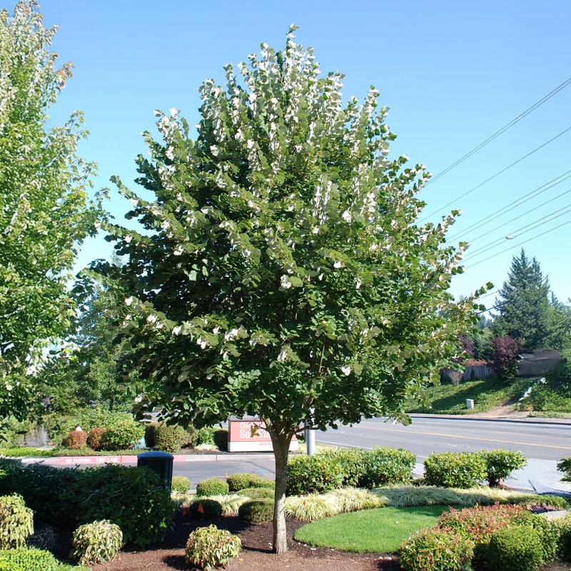 An elegant shade tree with a strong central leader and symmetrical pyramidal form. Glossy green leaves have silvery undersides that shimmer in the breeze. Fragrant yellow flowers bloom in early summer, attracting pollinators. Heat and pollution tolerant—ideal for urban landscapes.
