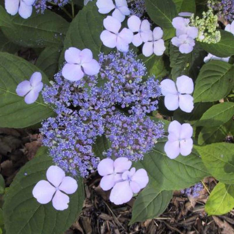 This long blooming, robust selection of lace-cap hydrangea features deep blue, fertile flowers surrounded by pale blue, sterile florets. The leaves turn a superb copper-red color in fall.