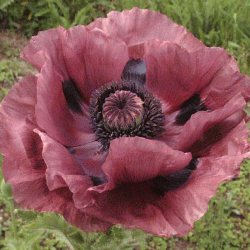 The large flowers of 'Patty's Plum' are a unique shade of smoky purple and blotched with black at the petal bases. They appear in early June over beautifully dissected, silver haired foliage