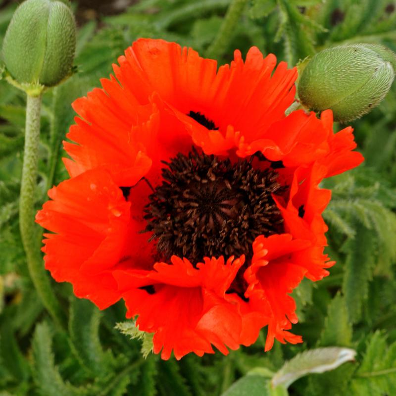 Huge, impressive, fiery-red flowers with distinctively fringed edges appear in early June on these coarsely hairy, stiff-stemmed plants with long, deeply-lobed leaves.