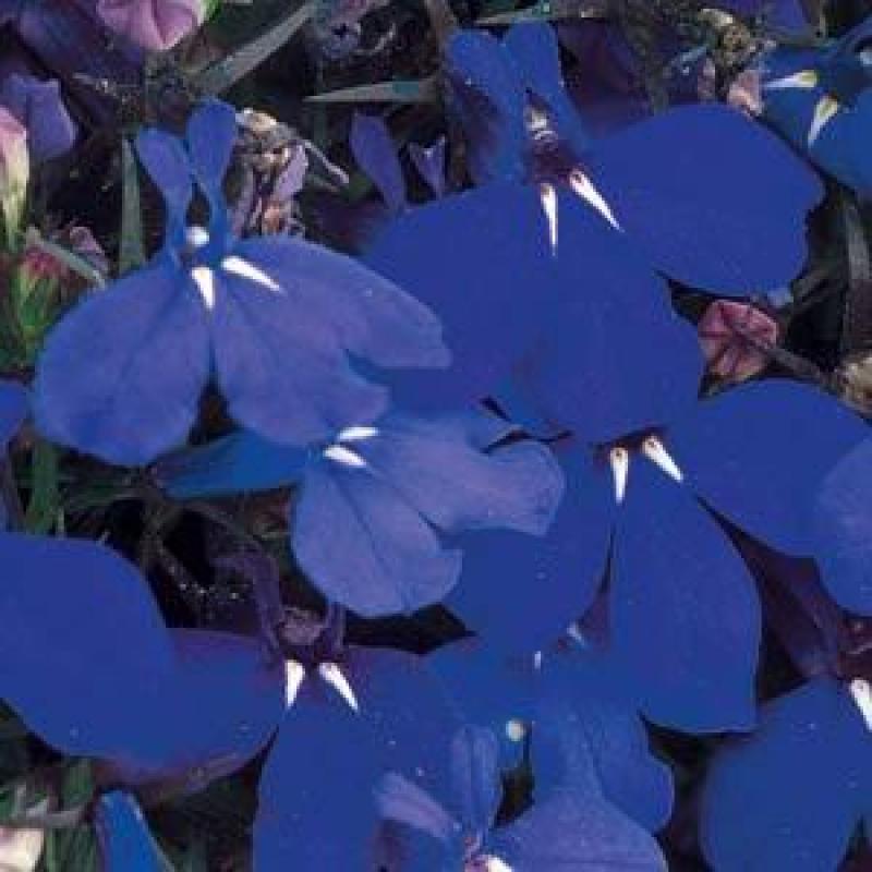 Rounded upright plants have delicate deep marine-blue flower accented by white center markings.