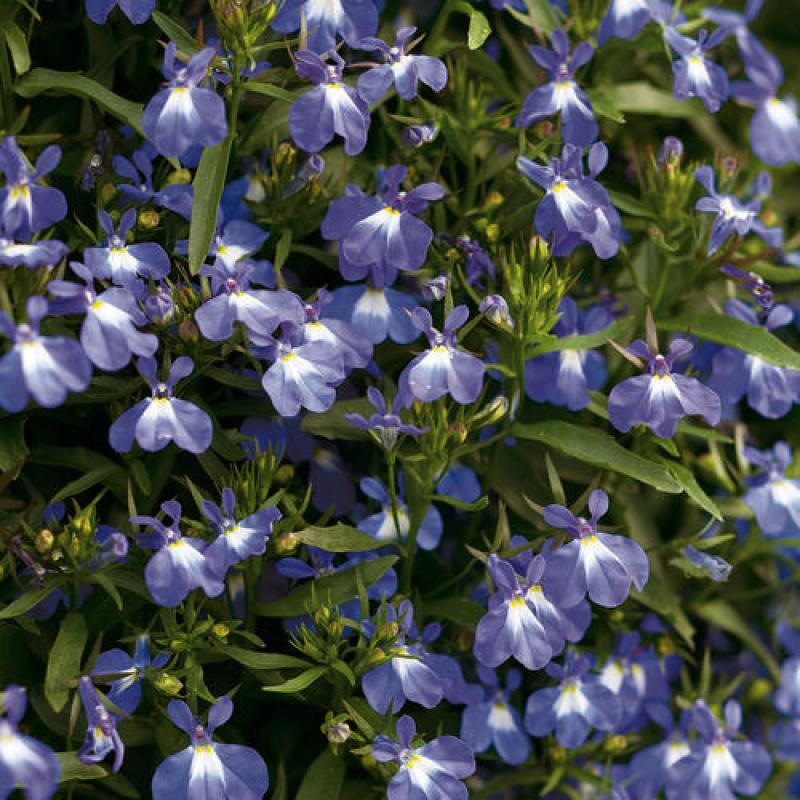 A compact semi-upright variety with delicate flowers of bright true blue with white interiors, lovely in containers and window boxes, much more heat tolerant than some other varieties.