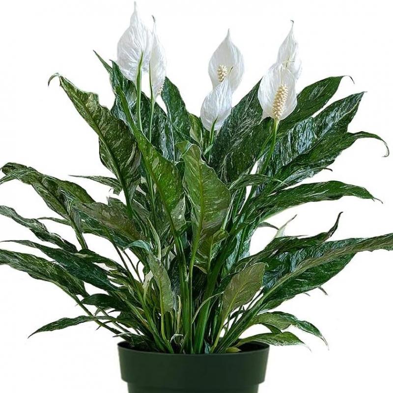 Domino' is a newer variety of Peace Lily that is easy to care for and makes a compact table-top plant. The foliage is lightly variegated with whitish streaks.