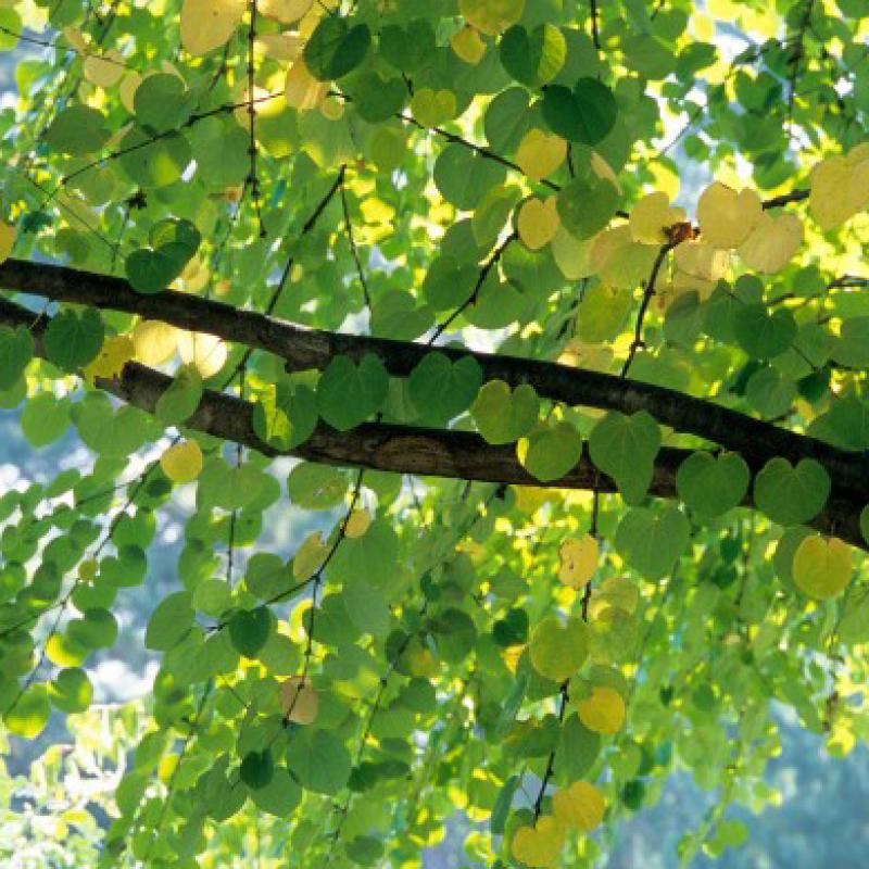 A lovely specimen, the foliage emerges bronze-red before turning to gray-blue-green with rounded heart-shaped leaves. The habit begins pyramidal in youth but will become broad with age. Fall foliage can feature a mix of orange, peach, and yellow.