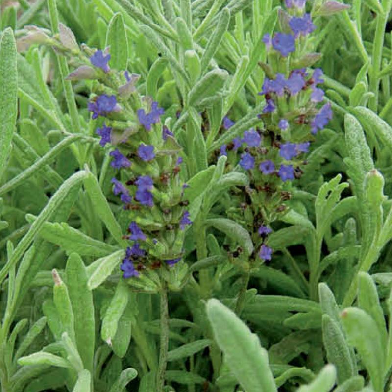The deep blue-lavender flowers of 'Goodwin Creek' emerge over wooly, white-gray, scalloped foliage which emits a lovely fragrance.