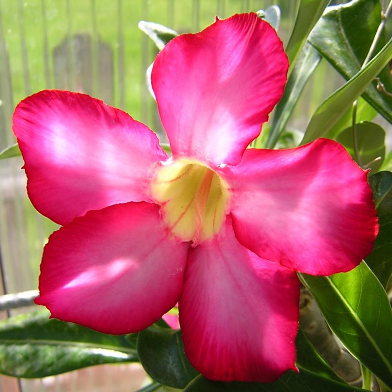 Desert Rose will produce a massive stem when growing older, but will start blooming when quite young. Like Oleander, its sap is poisonous.