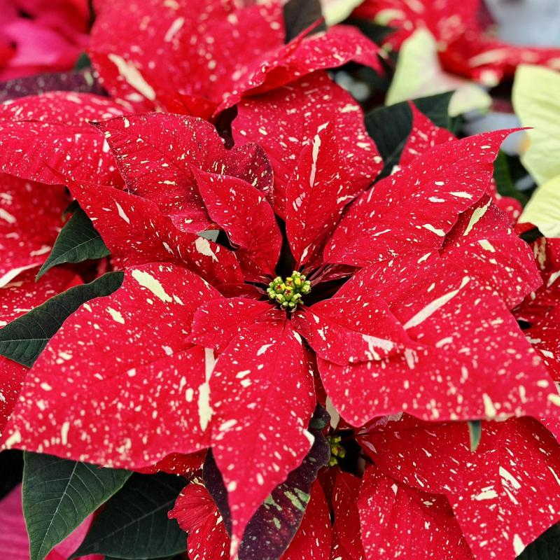 'Red Glitter' features a red background and white splotches across the bracts. The red color is brighter than other spotted varieties.