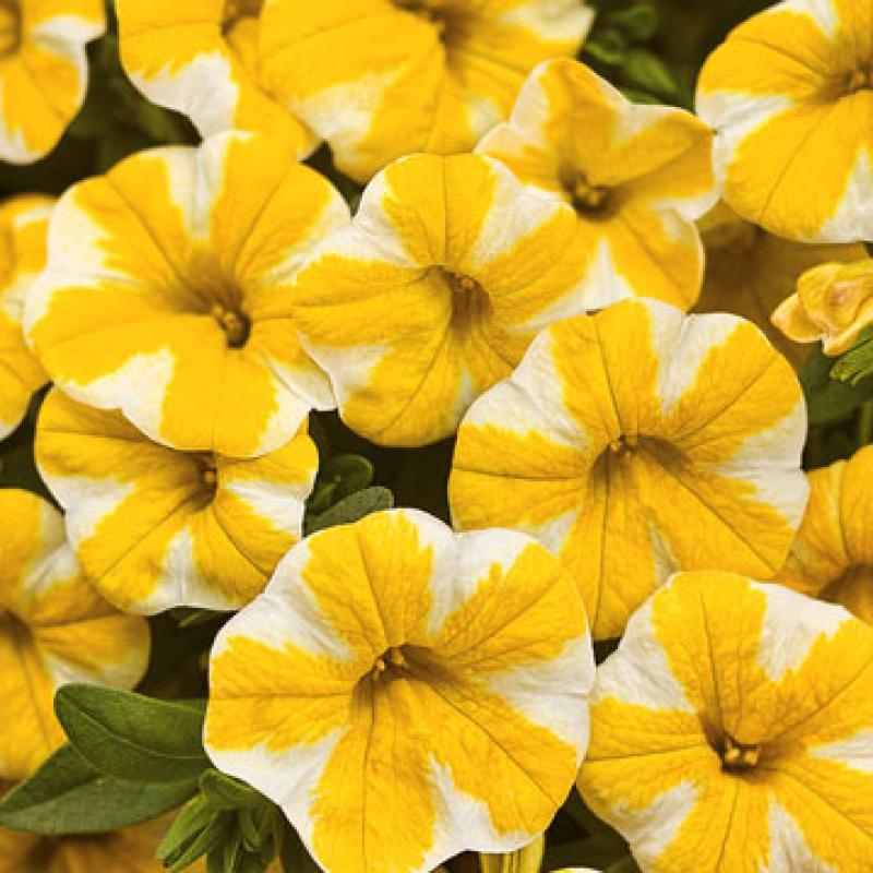 This variety boasts an abundant amount of small petunia-like yellow flowers with wide white stripes all season on cascading drought and heat tolerant plants.