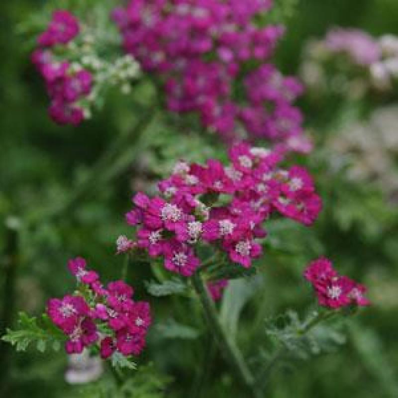 The deep violet-pink flowers of this variety have cream centers and are held in flat clusters. Boasting excellent color retention, they bloom from June until July over fragrant, finely divided foliage. A compact plant habit is an added bonus.