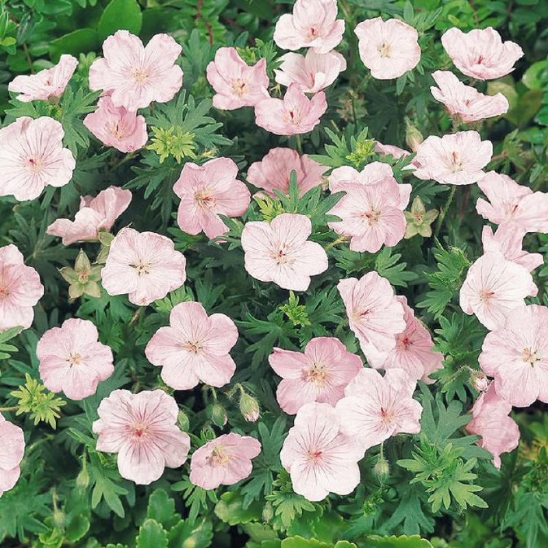 Shell-pink flowers bloom all summer over small, deeply divided, deep green foliage that will create a low mound and offer good red fall color.