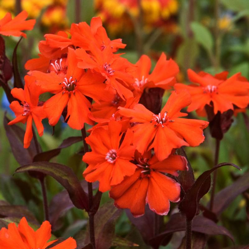 The scarlet-orange flowers of this variety are set off by deep purple stems above purple-bronze tinted green foliage. Blooms from late June to July.