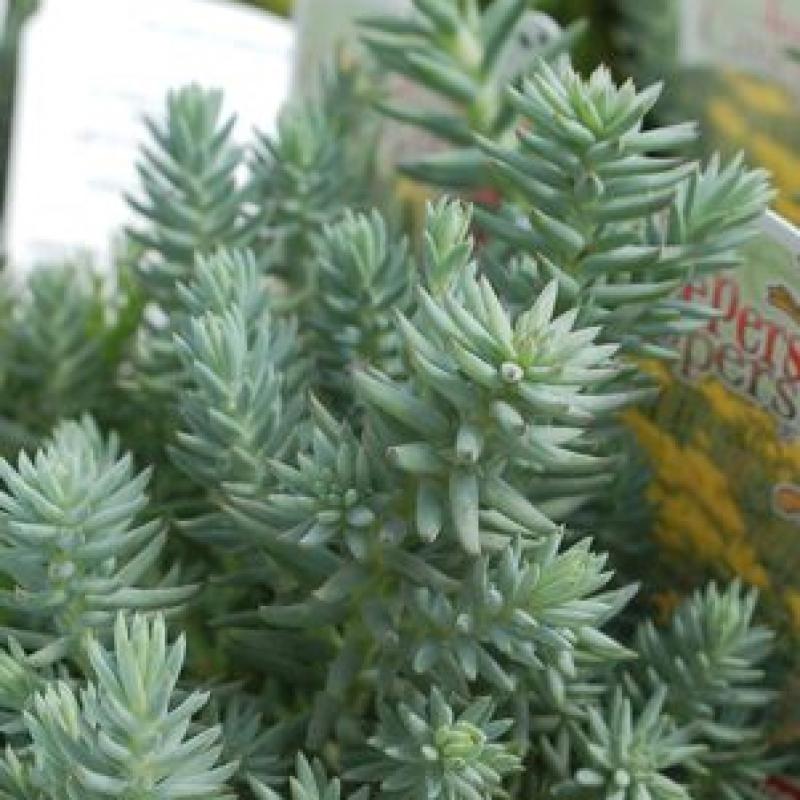 This variety generates a mass of spreading, blue-green, foliage that resembles Blue Spruce needles. It will thrive in sunny locations and sandy soils. Intense sulfur yellow flowers in July complete the look.