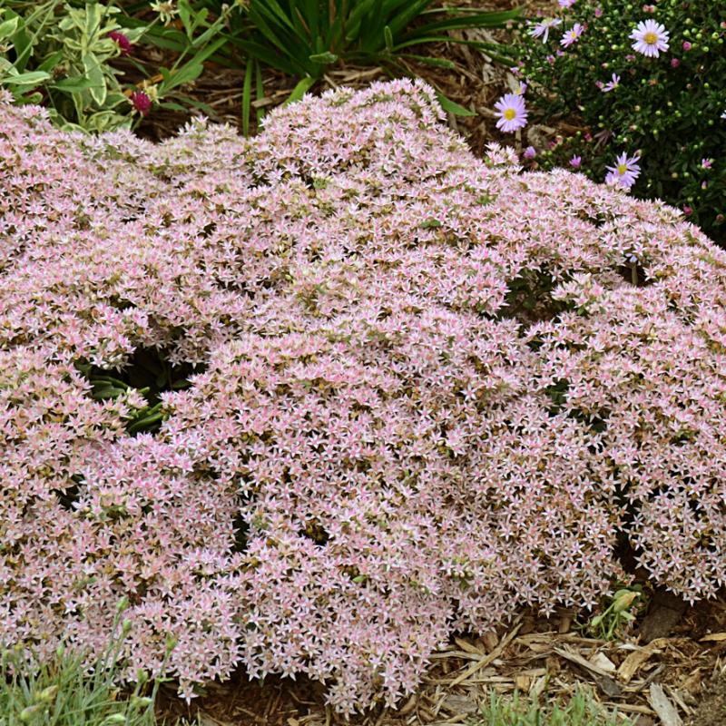 'Pure Joy' forms a low, rounded mound, growing to just under 1' tall by summer. Its light green leaves become covered in a dome of bubblegum pink flowers in late August and September, followed by interesting seed heads.