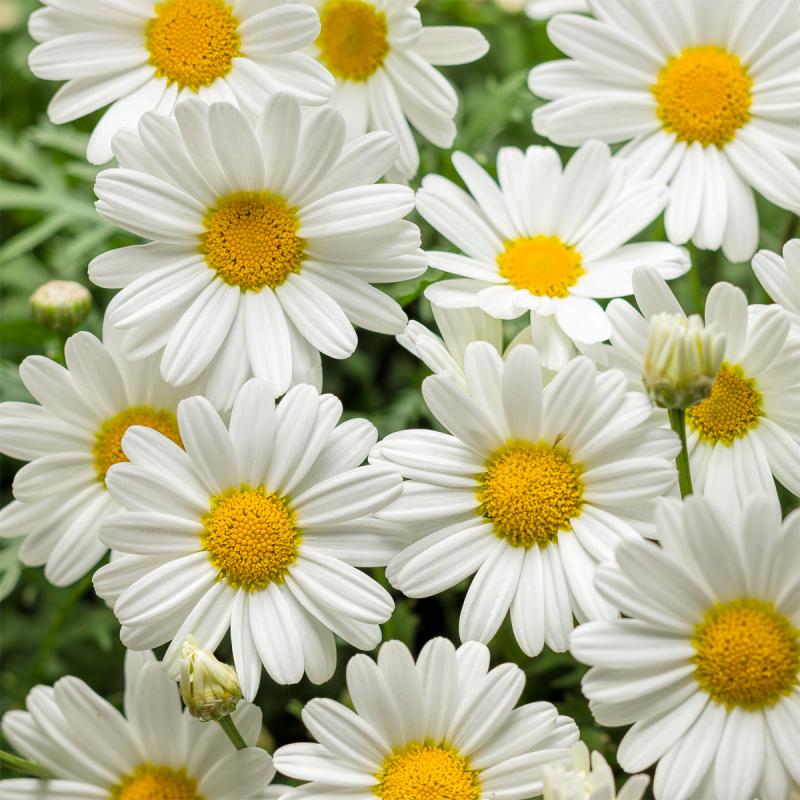 Large daisy-like flowers of pure white with bright yellow centers will cover this upright, mounded, easy-care plant from spring until frost.