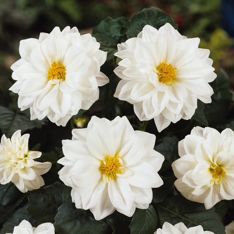 This early flowering dwarf plant sports rich green, glossy foliage and double bright white flowers with yellow centers that last all season long.