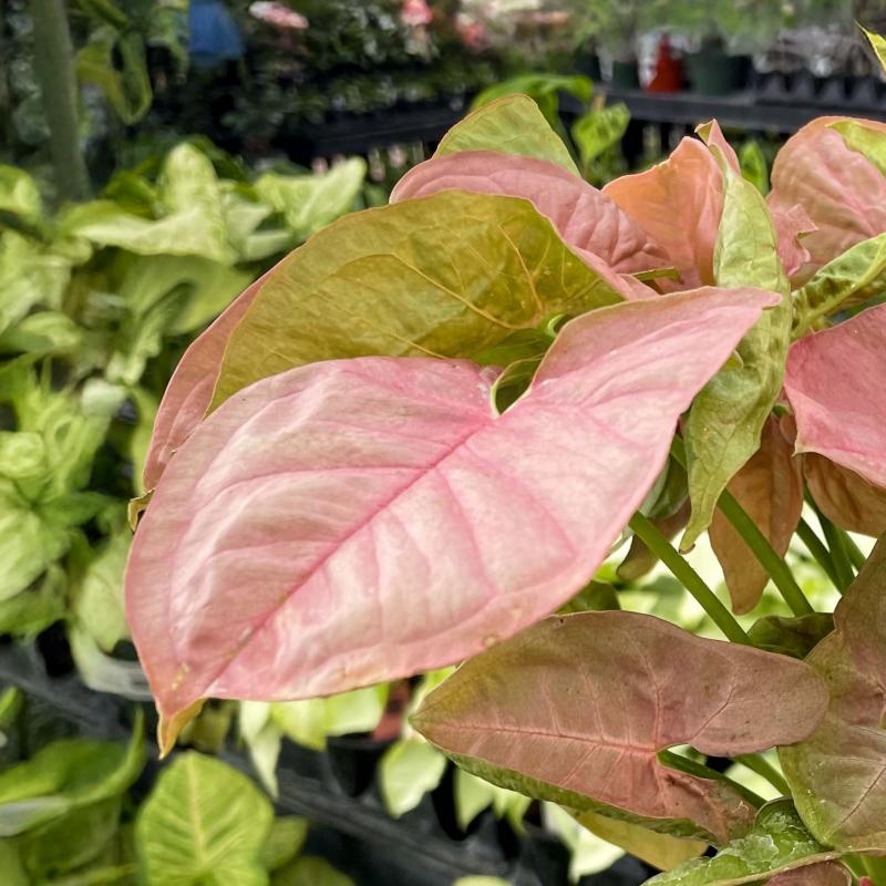 A vibrant pink variety of arrowhead vine that brings a cheerful pop of color to any space. Its heart-shaped leaves blend shades of rosy pink and soft green, offering year-round tropical appeal indoors.