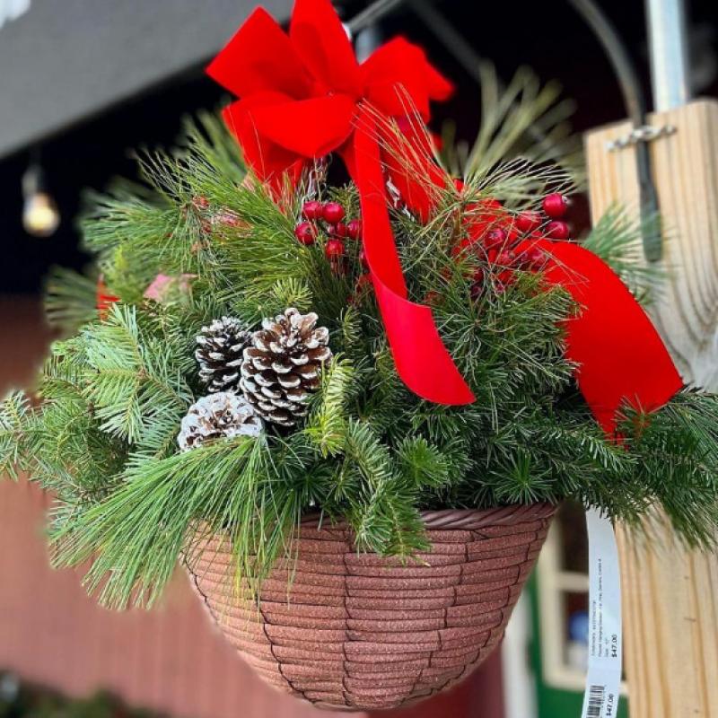 Celebrate the holidays with the look and fragrance of fresh greens! This hanging basket is bursting with fresh greenery and festive accents, including berries, cones and a handsome bow. It's the perfect way to dress up your deck, porch or patio for the holidays!