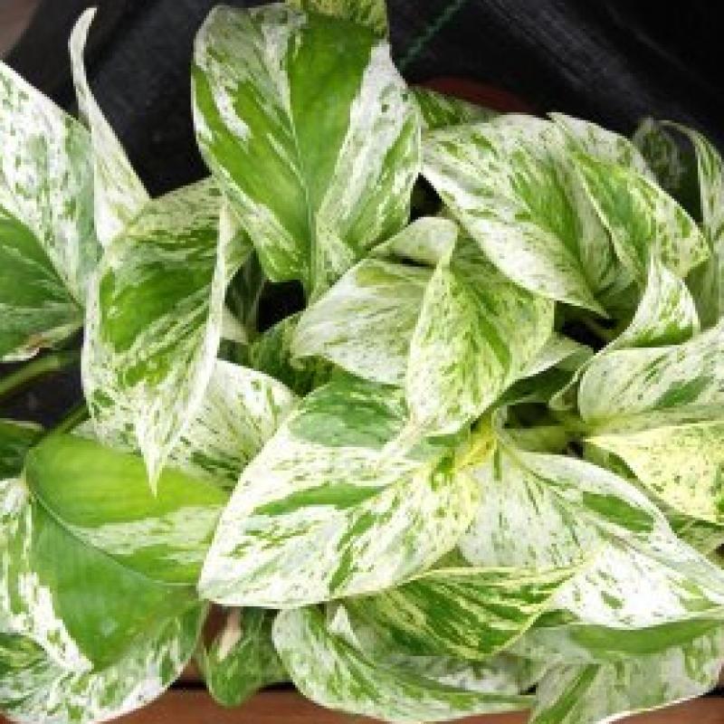 Marble Queen' is a climber known for interesting, marbled green and white, heart-shaped leaves on a trailing stem.