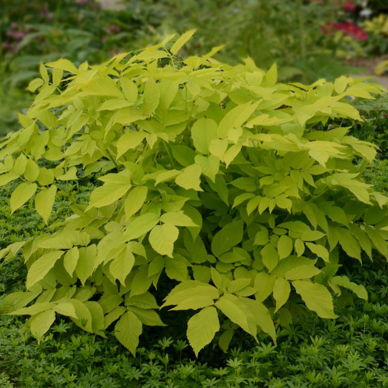 An eye-popping large scale plant in the shade garden which features large compound chartreuse leaves accented by red stems, it blooms in late July to August with tiny white flowers on two foot stalks followed by purple-black berries that the birds adore.