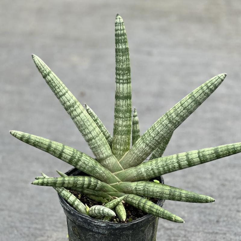 A striking, fan-shaped Snake Plant with short, rounded cylindrical leaves in soft green tones banded with gray-green stripes. ‘Boncel’ is highly architectural and thrives on neglect, making it one of the easiest and most sculptural indoor plants to grow.