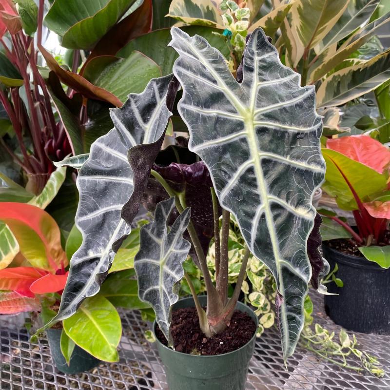 A dramatic tropical plant featuring arrow-shaped, deep green leaves with bold white veins and rich purple undersides. Its striking contrast and sculptural form make it a standout focal point in any indoor plant collection.