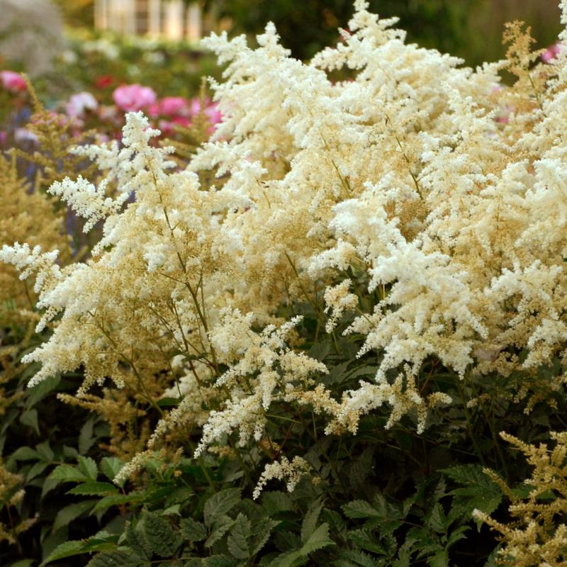 The full and airy white plumes of 'Deutschland' glisten in late June over dark green foliage.