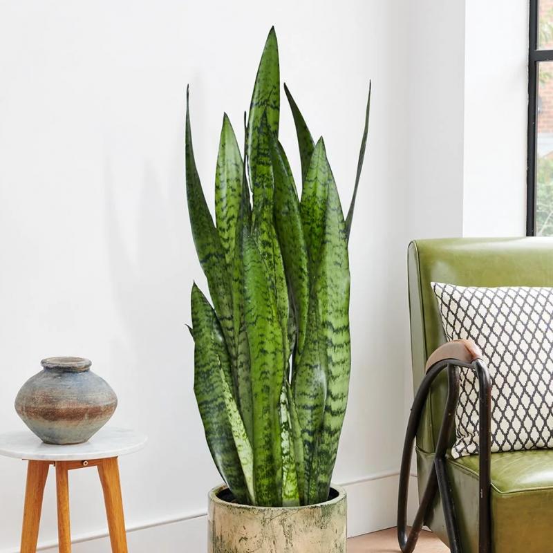 A tall, sculptural Snake Plant with upright, sword-like leaves marked by dark green banding. Exceptionally hardy and tolerant of neglect, this plant is perfect for adding vertical interest and purifying the air in any indoor space.