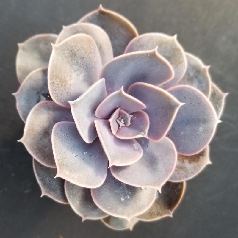 This classic rosette-forming succulent offers pearlescent purple and pink tones overlaying silvery blue leaves. It will prefer partial sun or bright light and a porous, fast draining soil. Water from the bottom when the soil is dry.